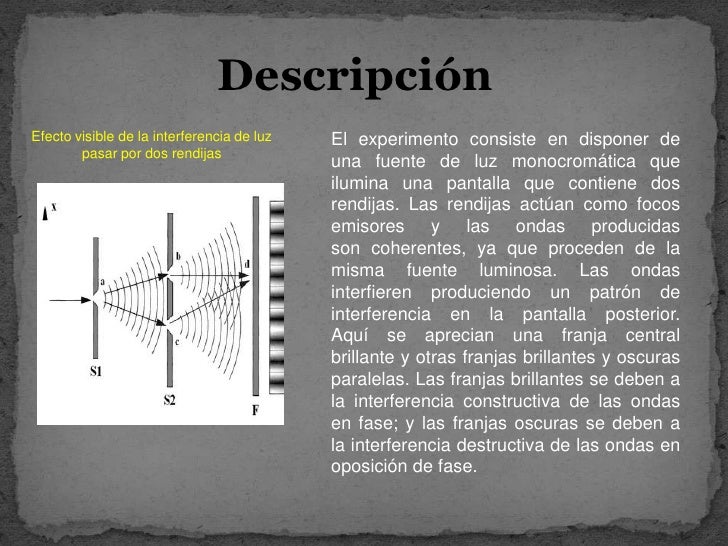 Sería fácil explicarlo mediante la teoría ondulatoria. La banda luminosa representaba el refuerzo presado por las ondas de un rayo a las ondas del otro. Dicho de otra manera: Entraba “en fase” dos trenes de ondas, es decir, ambos nodos, al unirse, se fortalecían el uno al otro. Por otra parte, las bandas oscuras representaban puntos en que las ondas estaban “desfasadas” porque el vientre de una neutralizaba el nodo de la otra. En vez de aunar sus fuerzas, las ondas se interferían mutuamente, reduciendo la energía luminosa neta a las proximidades del punto cero.
