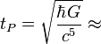 Es el tiempo que necesita el fotón (viajando a la velocidad de la luz, c, para moverse a través de una distancia igual a la longitud de Planck. Está dado por segundos, donde G es la constante gravitacional (6’672 59 (85) ×10-11 N m2 kg-2), ħ es la constante de Planck racionalizada (ħ = h/2π = 1’054589 × 10-34 Julios segundo) y c es la velocidad de la luz (299.792.458 m/s).