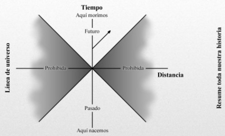 Nuestra línea de universo resume toda nuestra historia, que nacemos hasta que morimos. Cuanto más rápido nos movemos más se inclina la línea de universo. Sin embargo, la velocidad más rápida a la que podemos viajar es la velocidad de la luz. Por consiguiente, una de este diagrama espacio-temporal está “prohibida”; es decir, tendríamos que ir a mayor velocidad que la luz para entrar en esta zona prohibida por la relatividad especial de Einstein, que nos dice que nada en nuestro universo puede viajar a velocidades superiores a c.