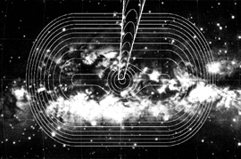Las bandas horizontales anchas representan a la radiación generada por la aniquilación desde el disco de la galaxia. La región circular de colores resaltados corresponde a la aniquilación radiactiva producida en el centro galáctico. La posible fuente de la antimateria particulada, descubierta por una radiación de aniquilación ascendente, se encontraría lejos del plano de la galaxia.