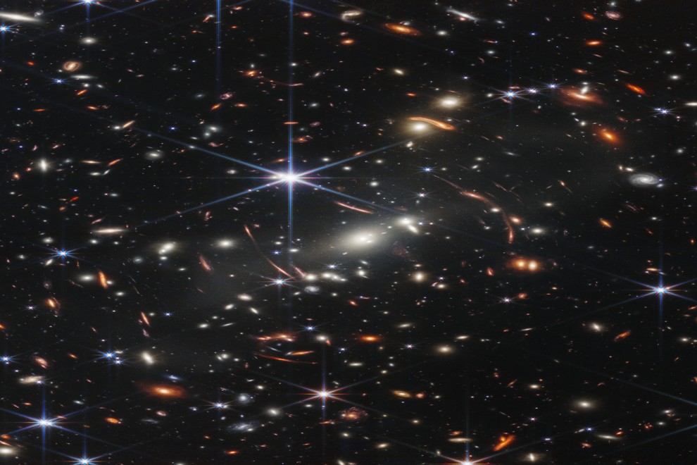 Imagen de una porción del cielo conocida como GOODS South. Crédito: NASA, ESA, GOODS Team, y M. Giavialisco. En la imagen de abajo una panorámica de galaxias captada por el James Webb.